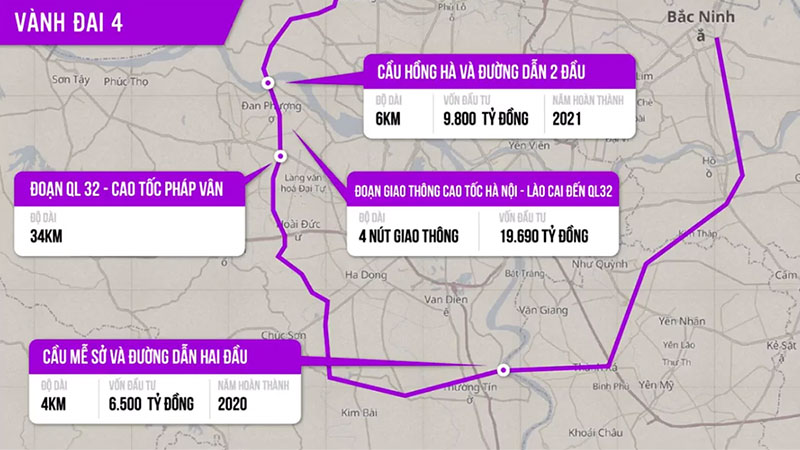 Đường vành đai 4 Hà Nội đã được thủ tướng chính phủ phê duyệt vào năm 2013, tổng vốn đầu tư lên tới 66.500 tỷ VND. Đây là một trong những tuyến giao thông trọng điểm của Hà Nội, dự kiến sẽ được khởi công & hoàn thành trong giai đoạn năm 2021 – 2025.